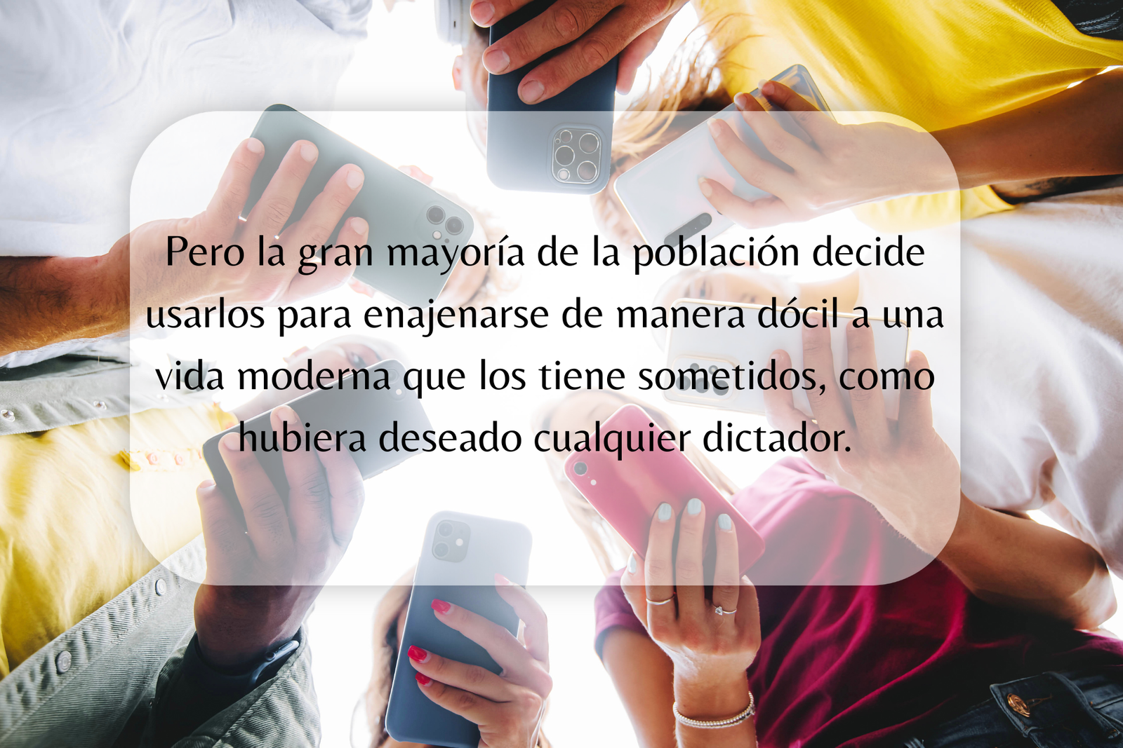 Pero la gran mayoría de la población decide usarlos para enajenarse de manera dócil a una vida moderna que los tiene sometidos, como hubiera deseado cualquier dictador.